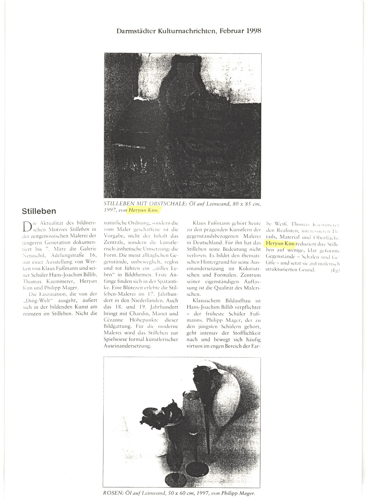 1998. 1. Darmstädter Kulturnachrichten 다름슈테터 쿨투어나흐리히텐 “Leben der gemalten Stille 그려진 정적 속의 생명력”